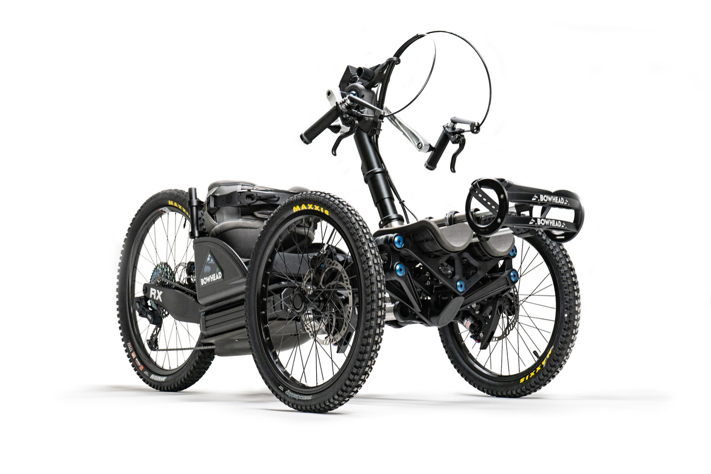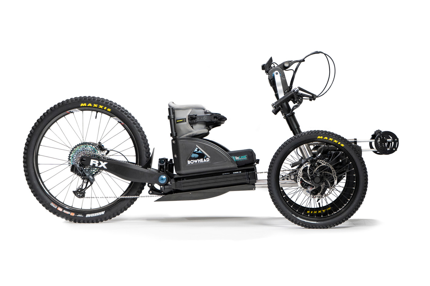 Bowhead RX – Hybrid Adaptative Mountain Bike integrates the Bowhead FLOW™ articulating front-end from our award-winning Bowhead Reach™bike with the new single-pivot MX-style rear swingarm and suspension system for a nimble and agile ride. Traversing off-cambered and rough terrain is a breeze, and the RX provides endless opportunities for access and exploration whether you’re hammering down a paved road, navigating a gravel track, flowing cross-country, or shredding single-track mountain trails.